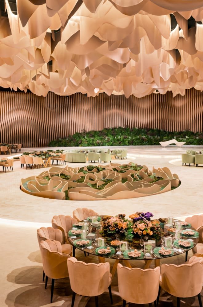 Ghayad asserted that since the main element of the wedding design was a desert rose it was exactly what he chose to create for the ceiling part. The art installation that he came up with consisted of multiple three-dimensional layers of fabric, each cut and arranged in complex patterns forming the shape of a Desert Rose.