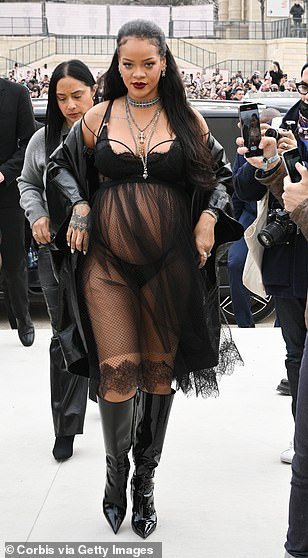 The singer, 34, flaunted her bare bump in racy black lingerie with a flowing mesh skirt as she arrived for the fashion event alongside stars including Anya Taylor-Joy, Maya Hawke and Iris Law for the runway event.