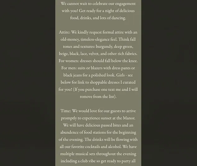 The future bride and groom sent a lengthy message to guests ahead of the celebration, which included a 75-word ‘old money’ dress code.