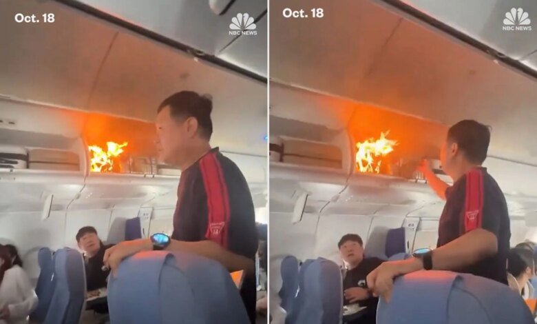 - Footage of the incident shows bright flames and smoke emanating from an open overhead compartment