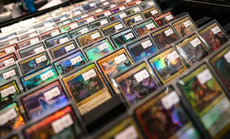 Trading cards of the game “Magic” are located in a shop where a “Magic” tournament is taking place.