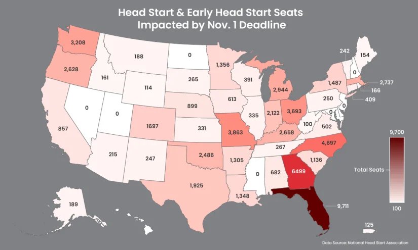 By Nov. 1, an additional 134 programs across 41 states and Puerto Rico, serving 58,627 children, will face the same fate. In Florida alone, 9,711 Head Start and Early Head Start seats are threatened.