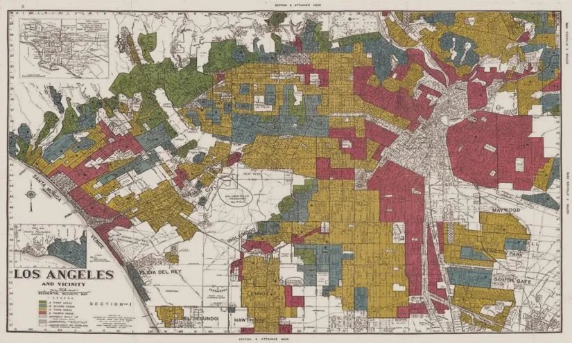 Redlining maps were developed by the federal government for use in mortgages and color-coded neighborhoods by their perceived investment risk. Areas with large numbers of Black residents were graded as “hazardous” and marked in red, leading to decades of disinvestment and segregation.