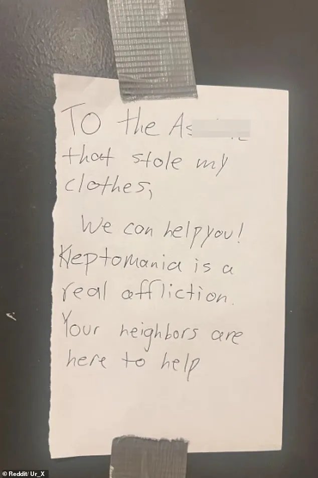 ‘To the a**hole that stole my clothes, we can help you! Kleptomania is a real affliction. Your neighbours are here to help.’