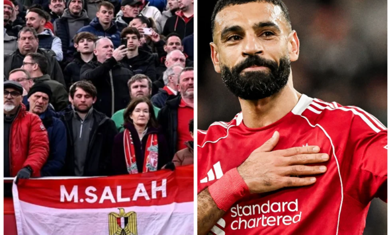 The clip shows Liverpool fans chanting Salah’s name and chanting the famous song dedicated to him, “Mo Salah… Mo Salah… the Egyptian King,” while the Egyptian star appeared fighting back tears and giving a long salute to the stands.
