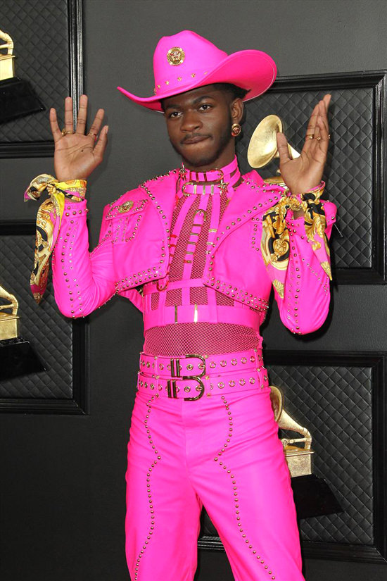One of Lil Nas X’s most high-fashion moments look to date has to be his jaw-dropping pink Versace number from the 2020 Grammys complete with sexy harnesses, belts and tons of gold studs.