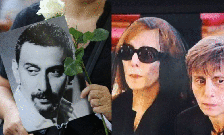 A mourner holds up a rose and a portrait of renowned Lebanese musician and composer Ziad Rahbani as crowds gathered outside Khoury Hospital in Beirut’s central Hamra district to bid him farewell before his funeral procession on July 28, 2025. (Photo by ANWAR AMRO / AFP)/ Fairouz and Rima Rahbani (social media)